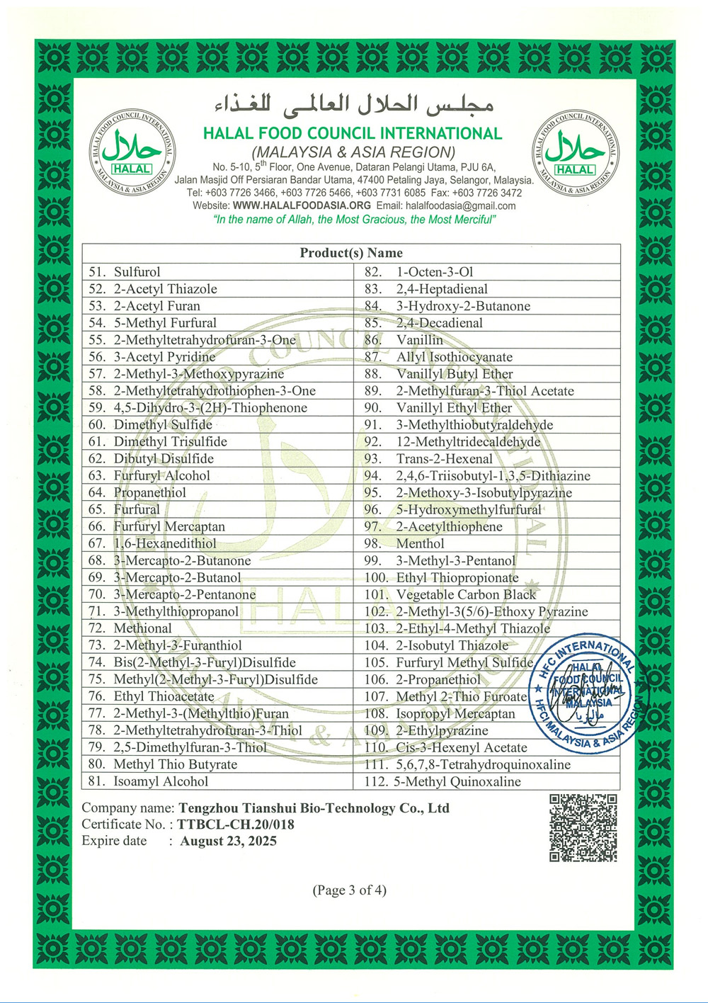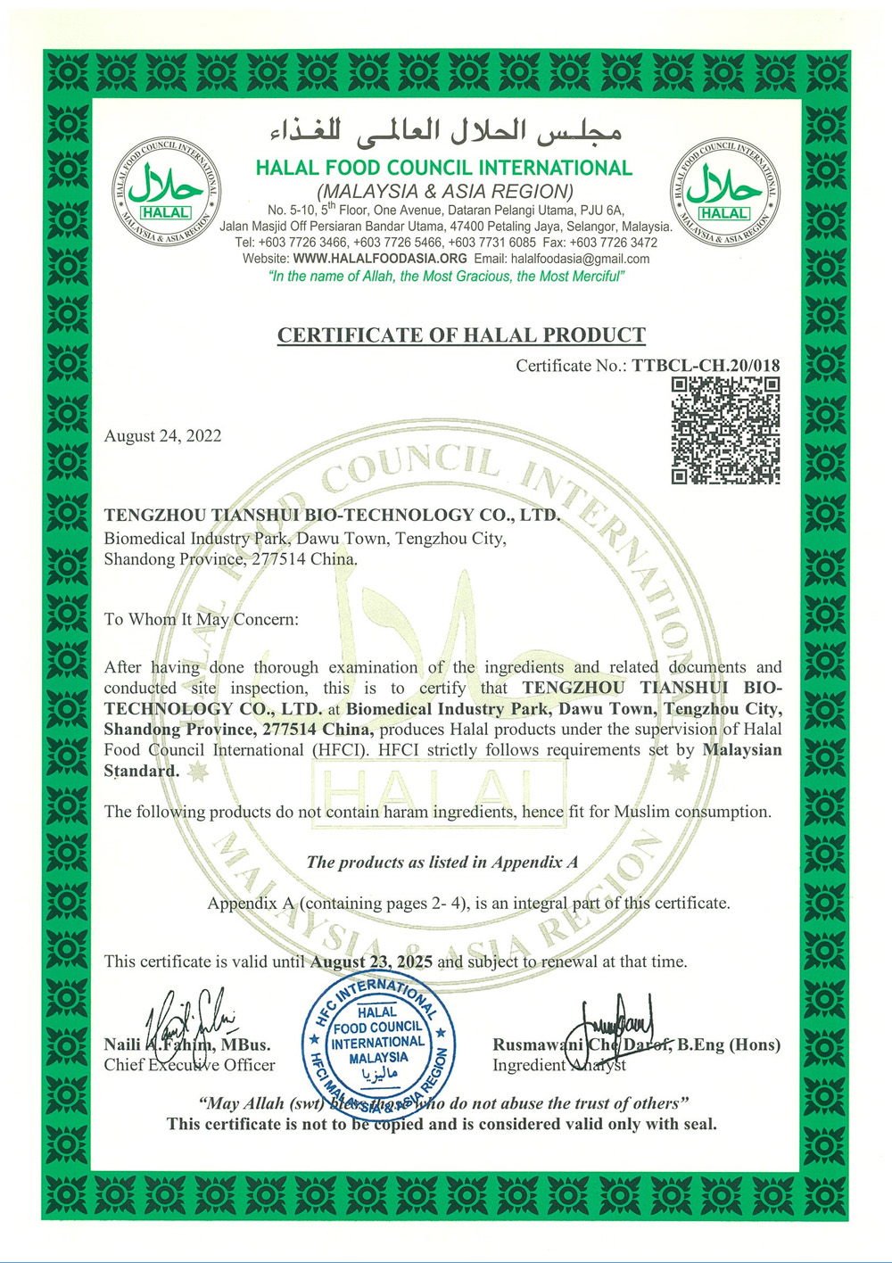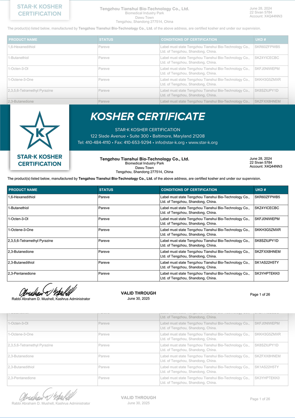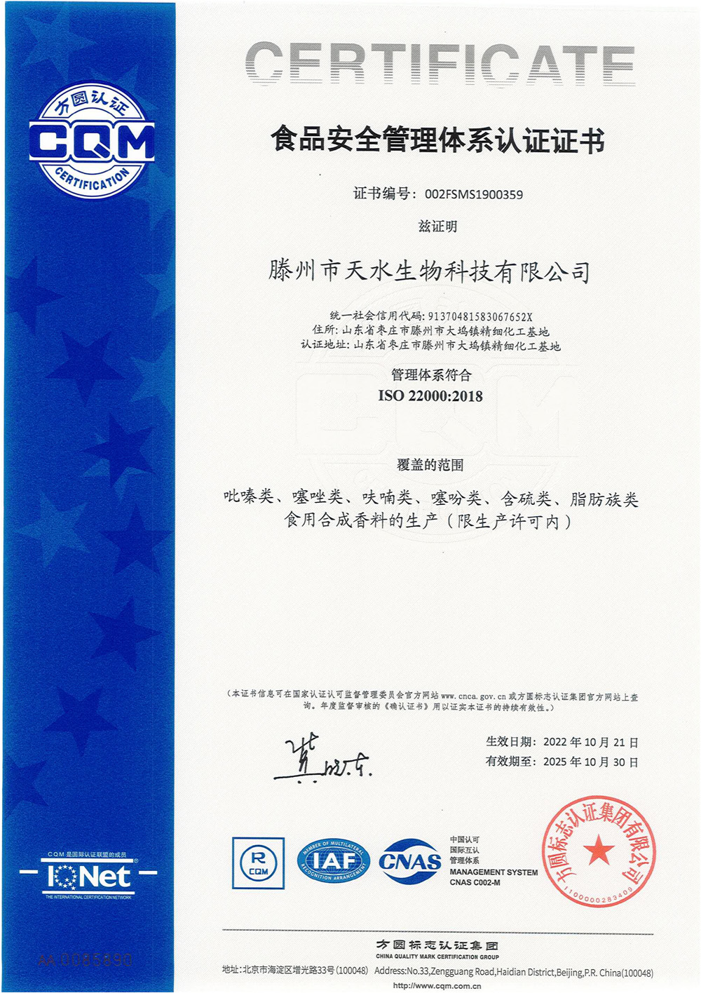 滕州市天水生物科技有限公司成立于2011年9月,是目前國內(nèi)雜環(huán)類合成食品香料、日化香料和醫(yī)藥中間體生產(chǎn)經(jīng)營的綜合性企業(yè)。坐落于山東省滕州市生物醫(yī)藥產(chǎn)業(yè)基地,總投資5000余萬元,占地面積約30000平方米,員工百余人。公司先后被評為高新技術(shù)企業(yè)、專精特新中小企業(yè)、科技型中小企業(yè),建有市級重點實驗室1處,并先后獲得ISO9001質(zhì)量體系認(rèn)證、ISO22000食品安全體系認(rèn)證、kosher認(rèn)證和Halal認(rèn)證。是香精香料及食品配料協(xié)會會員單位及滕州市中小企業(yè)協(xié)會理事單位。